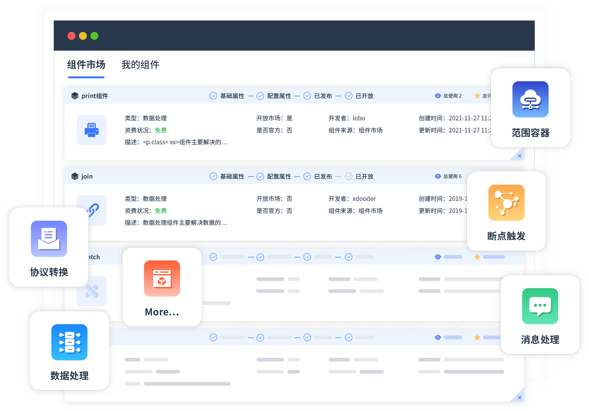 针对集成场景,,VIVO钱包提供组件市场,,,,例如协议转换、、、消息处理、、、、文件操作等。。除平台提供的组件外,,客户可以自定义所需组件。。