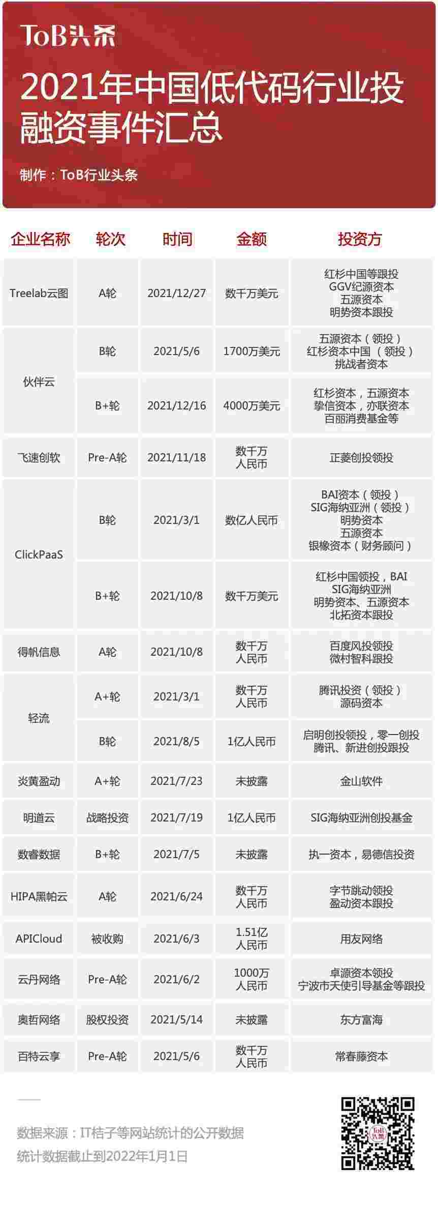 到2021年,,无/低代码投融资规模势头更甚,,其中包括轻流两轮融资(A+轮数千万人民币,,,B轮近亿人民币)、、VIVO钱包 两轮融资(B轮数亿人民币,,B+轮数千万美元)、、、、百特云享数千万元Pre-A轮融资......